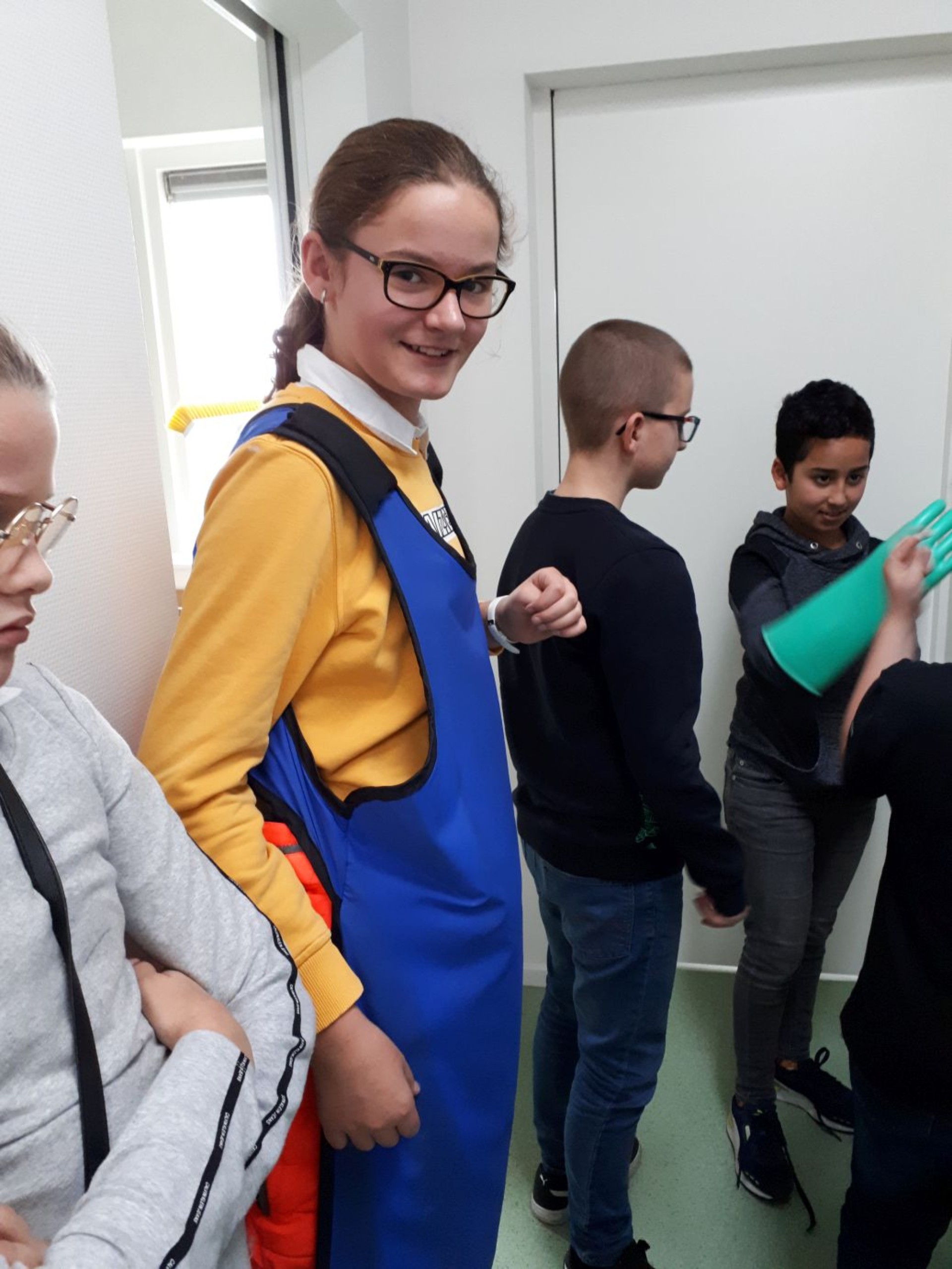 Vervolgens zien we de ruimte waar de röntgenfoto’s worden gemaakt en mogen de kinderen voelen hoe zwaar de loden handschoenen en de schort zijn die men moet dragen om zelf niet te veel straling te krijgen. Dan gaan we naar de operatiekamer, waar een pluchen hond al klaar ligt om geopereerd te worden. Waarom er een emmer onder de operatietafel hangt, willen de kinderen graag weten. Als laatste zien we de uitslaapkamer, waar een grote pluchen hond staat met een kap om, alsof hij net is geopereerd.