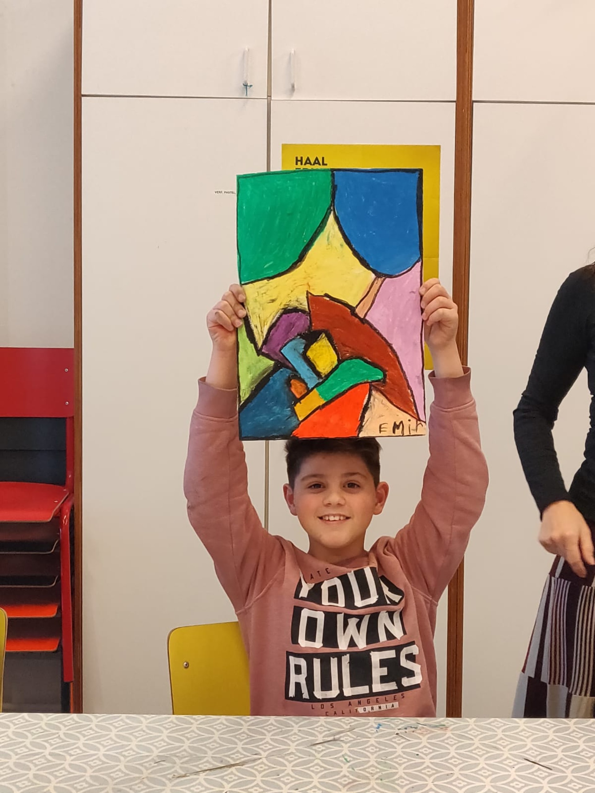 De tweede zondag was het thema Expositie. Een kunstenaar liet ons de expositie Wakker zien. Gemaakt voor en door kinderen. Met z'n allen lagen we in bed, maakten we een kunstwerk verder af. Tenslotte mochten we zelf een kunstwerk maken. De opdracht was: gebruik van een bestaand (niet zichtbaar) schilderij de vormen en kleuren van 1 zichtbaar rondje en maak het af met eigen fantasie. Moeilijk maar ook leuk. Ook hier weer mooie resultaten.