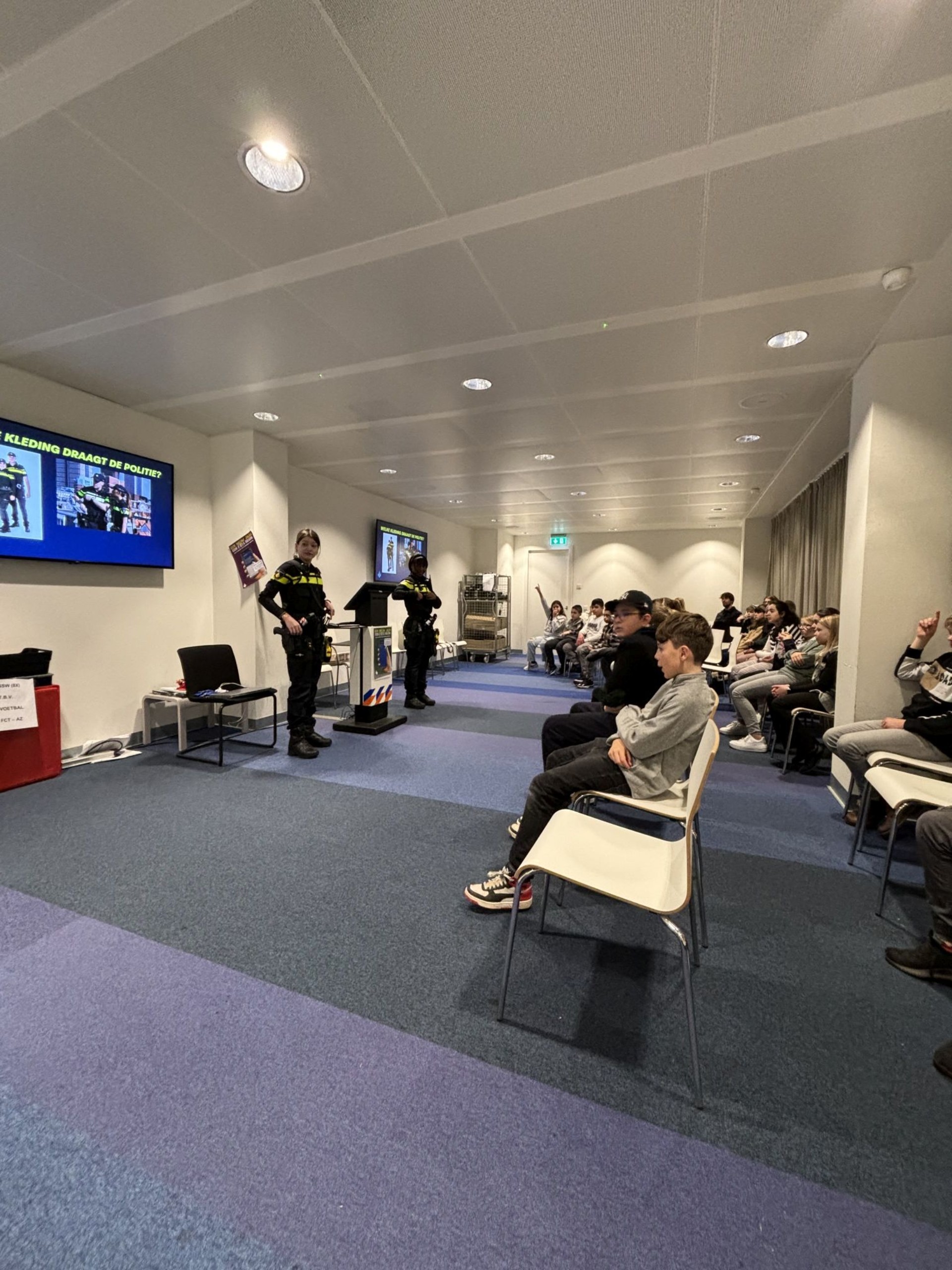 Hoofdagent Lot legt ons eerst van alles uit over wat een agent zoal allemaal bij zich heeft. Van handboeien, tot pepperspray, tot een wapenstok. Tevens mochten kinderen alle vragen stellen die ze maar hadden. Hierna kregen we een filmpje te zien over “stelen” als minderjarige. We moesten goed opletten, want hier moesten we na de lunch een quiz over maken. Na een gezamenlijke lunch en quiz werd de groep verdeeld en kregen we een rondleiding. De cellen, verhoorkamers, en zelfs de politieauto mochten we bekijken. Een aantal kinderen heeft zelfs het kogelwerend vest aan gehad. Dat was best zwaar. Ook hebben we in de “TOM” kamer gezeten. Dit is waar de officier van justitie een bepaalde straf of boete voorlegt aan de verdachte. Als klap op de vuurpijl kwam er een politieauto aan met een politiehond. Deze hond heeft laten zien hoe ontzettend goed hij voorwerpen kan opsporen. De kinderen waren en zijn nu nog enthousiaster geworden over De Politie. Lot, Bennie Beuvink, en Grace bedankt voor de organisatie!