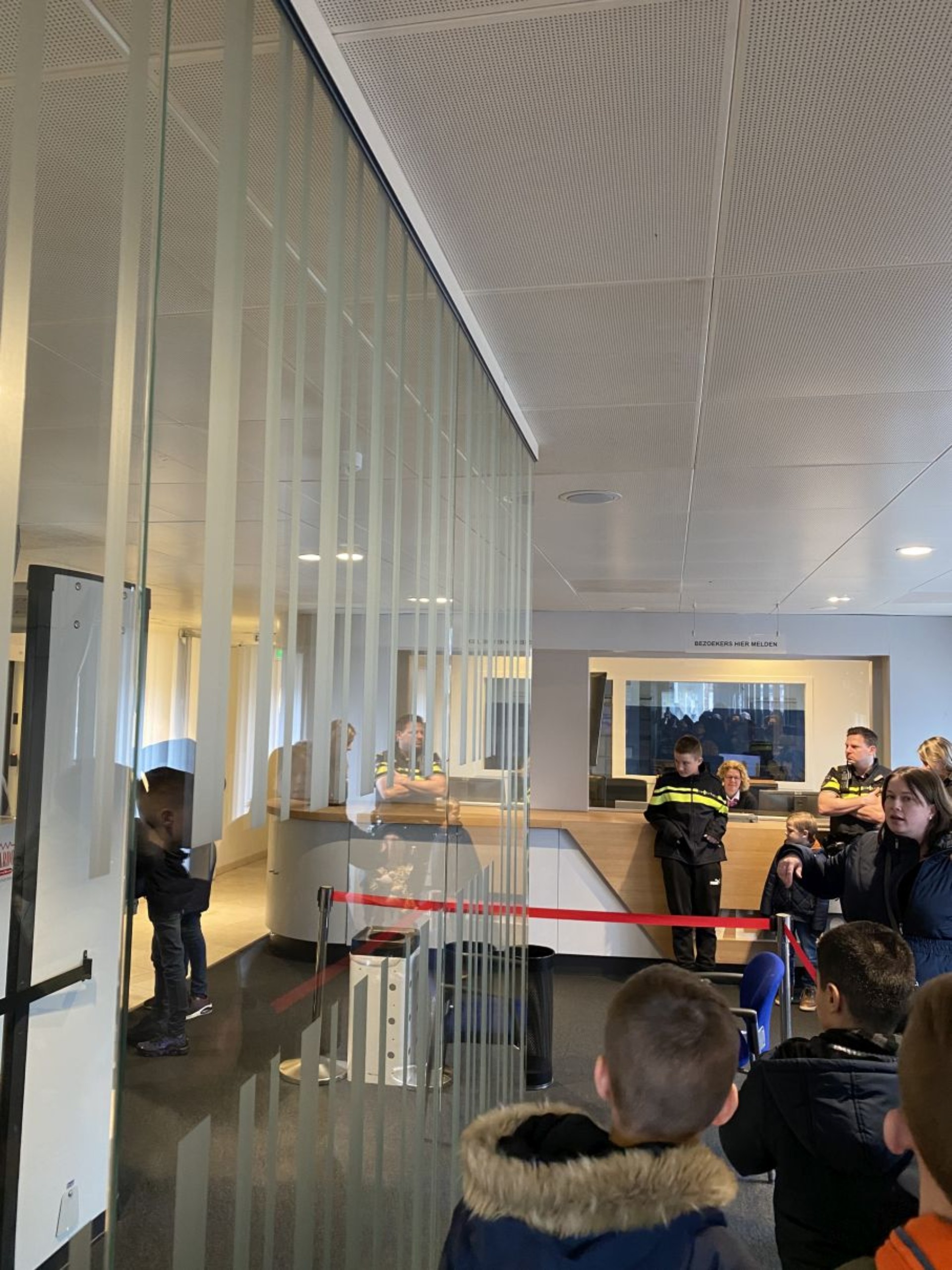 Dan is het tijd om naar de rechtbank te gaan. Bij binnenkomst ontmoeten we de bode. Zij heet ons welkom en laat ons zien dat alle mensen die de rechtbank binnen komen door een detectiepoortje moeten lopen om te kijken of ze geen gevaarlijke voorwerpen bij zich hebben. De kinderen mogen ook door het detectiepoortje lopen en al gauw blijkt dat enkele kinderen toch wel iets van metaal in hun zakken hebben. De bode neemt ons mee naar de bodebalie. Bij de bodebalie kunnen de mensen zich melden en dan worden ze doorverwezen naar de juiste zittingszaal. We mogen een kijkje nemen in een zittingszaal. De kinderen wordt gevraagd wie op welke positie moet zitten in de rechtszaal. Daarnaast valt het ons meteen op dat er een foto van de koning in de rechtszaal hangt. De rechters spreken namelijk altijd in naam van de koning. Ook zien we de twee verschillende deuren, waardoor de officier van justitie en de rechter binnenkomen. Vervolgens krijgen we nog een rondleiding door de politieagent, hij laat ons de cellen in de rechtbank zien, waarin de verdachten die in voorarrest zitten verblijven voorafgaand aan de zitting. Ook laten ze ons het politiebusje zien, waarmee deze verdachten worden vervoerd naar de rechtbank; daarin is het best wel krap zitten.