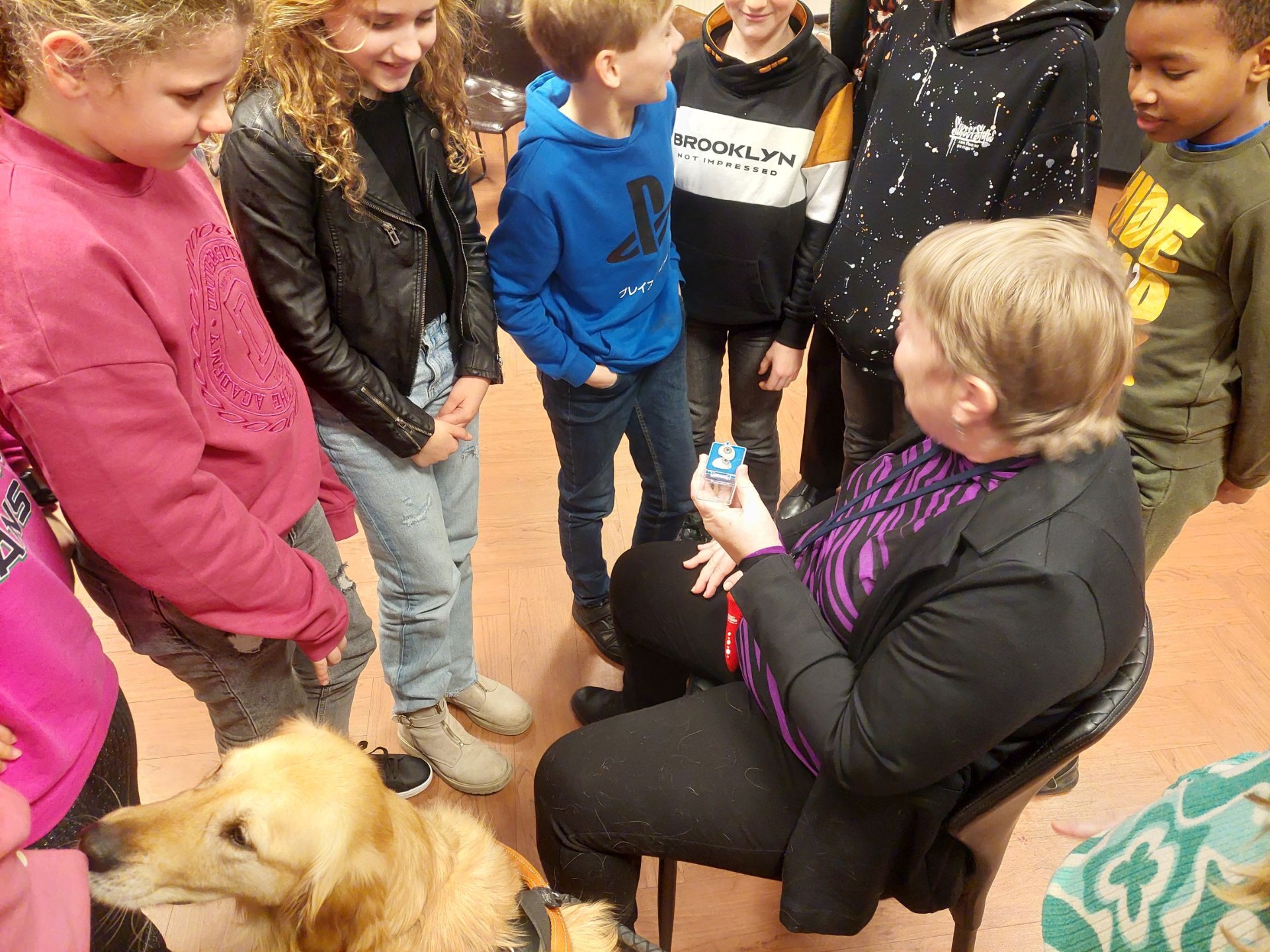 Na de lunch konden we gebruik maken van een zaal in de Reggehof waar Ellen heel erg veel over haar blindzijn heeft verteld. Ze had allerlei materialen mee zodat wij een beetje konden ervaren hoe het is om slechtziend of blind te zijn. Bijvoorbeeld door brillen op te zetten en te lopen met verschillende stokken, brailleschrift te ontcijferen en te kijken en te luisteren naar mogelijkheden op de telefoon van Ellen waarbij gebruik wordt gemaakt van Artificial intelligence (AI). En natuurlijk heeft ze verteld en laten zien wat haar geleidehond voor haar kan betekenen.